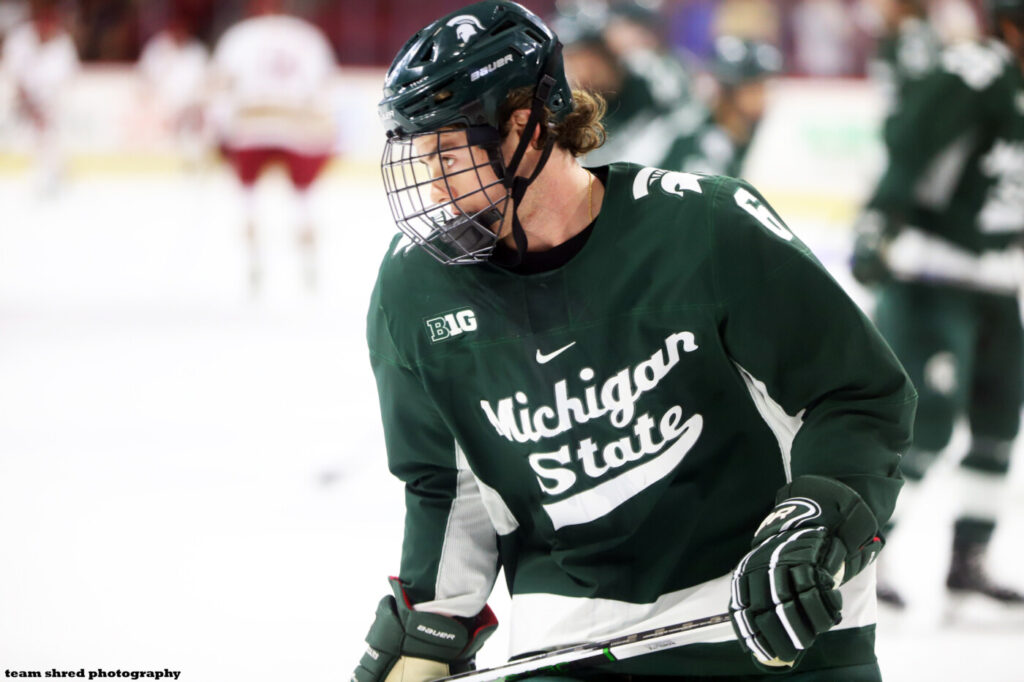 Michigan State University Spartans‘ sophomore defenseman Austin Oravetz(6) enters the transfer portal and will next play hockey at Merrimack College Warriors as a junior, 2025/2026.