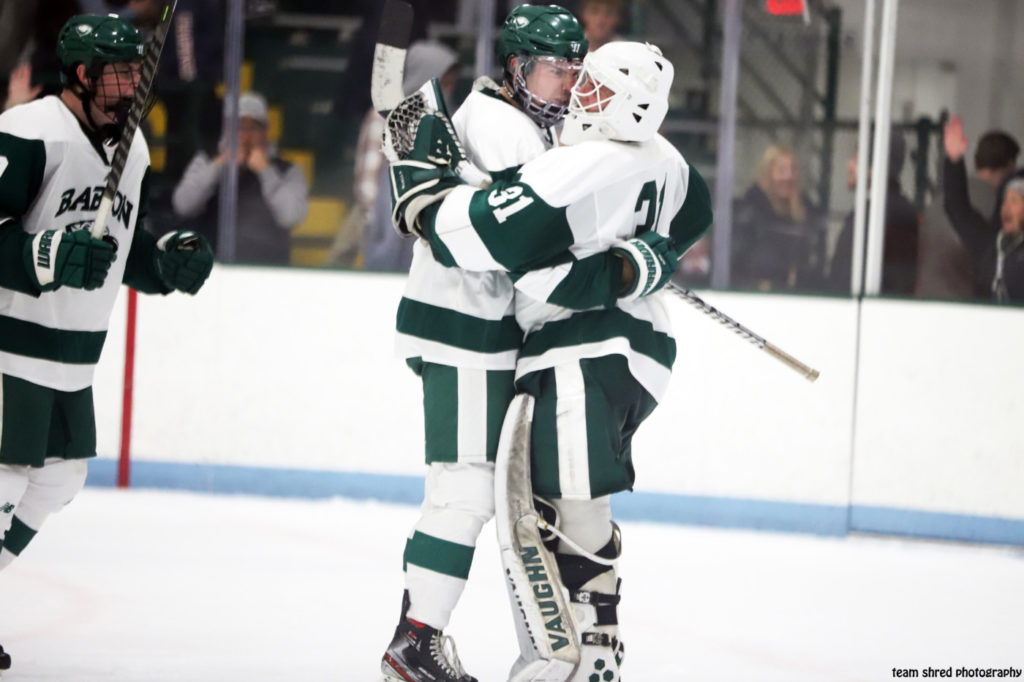 Senior defenseman Grey Owens(5) shows a lot of emotion for sophomore net minder Nate Mueller(31), when it comes down to the thus far unranked Babson College Beavers 1-3-1 NEHC take down of the #1 rated in the country D3 hockey team, Hobart College Statesmen, who just so happened won the whole NCAA thing in spring of 2023, by a count of 3-1.