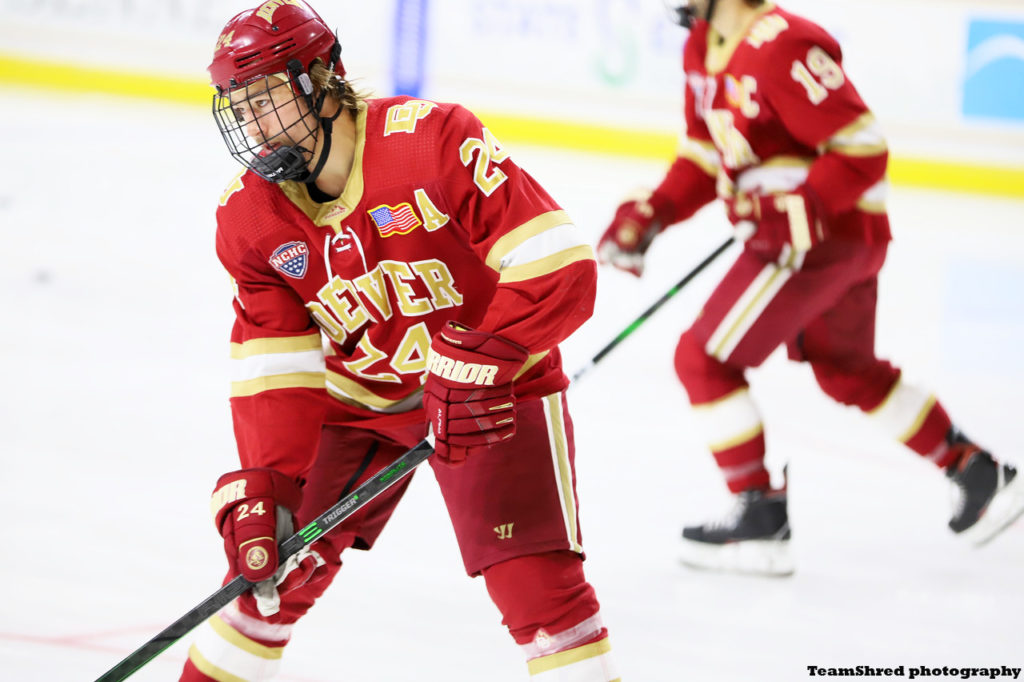 University Of Denver Pioneers‘ junior right wing Bobby Brink(24) already has a new best 15 assists and his 6 goals and 21 points are both en route to high marks set as a freshman and sophomore.