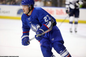 Trois Rivières Lions‘ rookie center Brendan Locke(27) is off to a hot start with 3 goals and 6 assists in 16 ECHL games with a +5 rating, as the team heads into its 1st playoff berth.