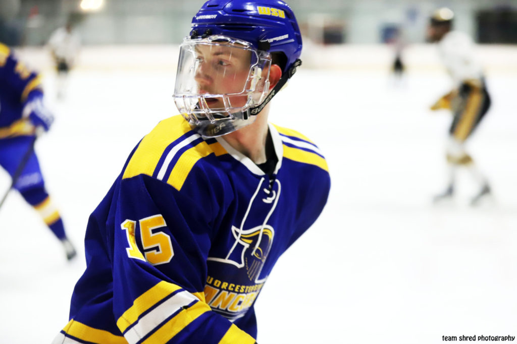 Worcester State University Lancers‘ junior right wing Brigham Neuhold(15) has 6 goals, new best 16 assists and is tied for the team in lead with 22 points this season in 26 games with a +3 rating on a losing record club.