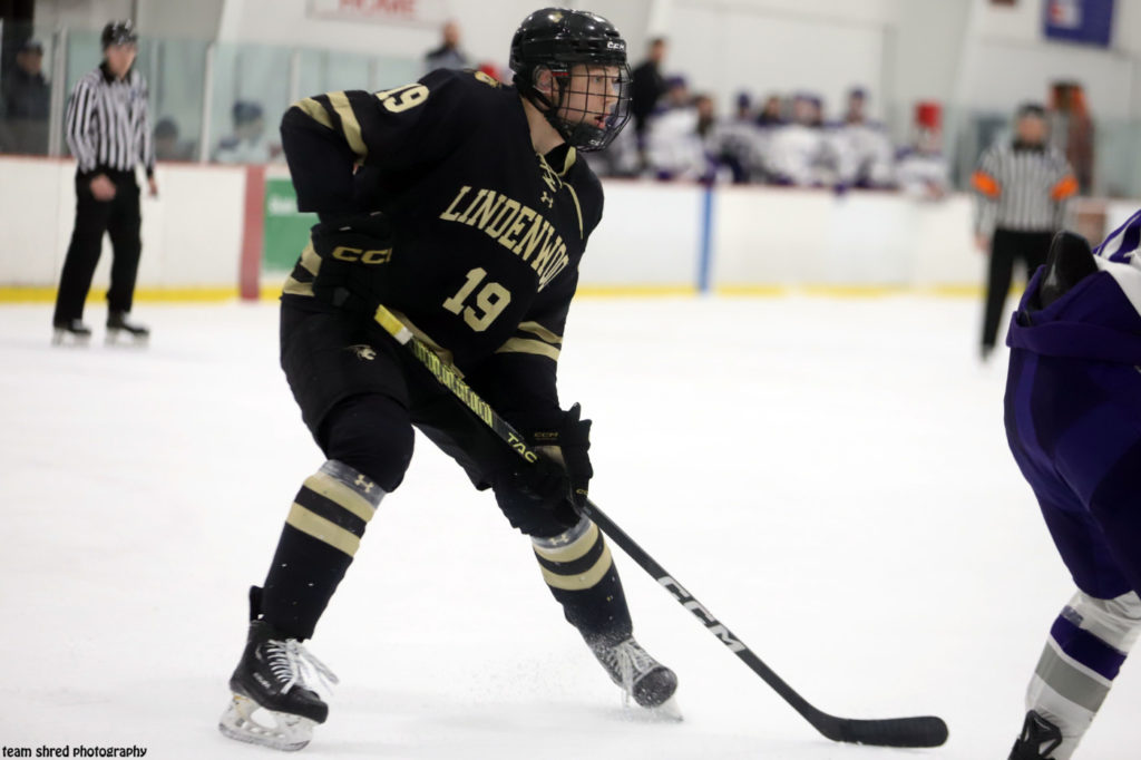 Lindenwood University Lions‘ senior left wing Caige Sterzer(19) seemed to embrace NCAA D1 play more as a junior, coming away with 8 goals and 14 assists in 29 games.