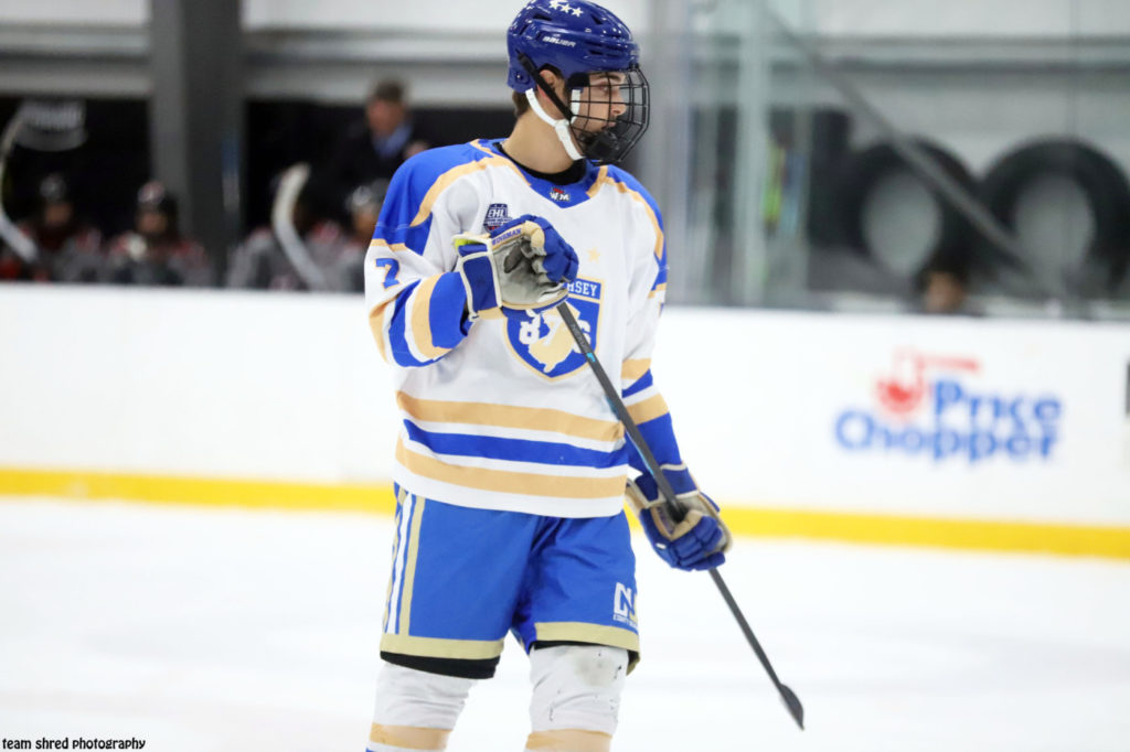 New Jersey 87’s 2nd EHL year defenseman Cole Douglas(7) is putting up junior career best stats with 5 goals and 12 assists in 31 games after only scoring 4 points in 32 games last season.