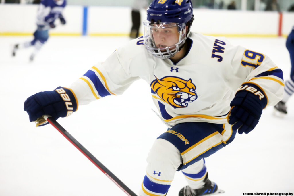 Johnson & Wales University Wildcats‘ sophomore transfer left wing Connor Nelson(19) has a college best 3 assists and 6 points and needs just 1 more goal to equal his mark from his freshman season at University Of Dubuque Spartans.