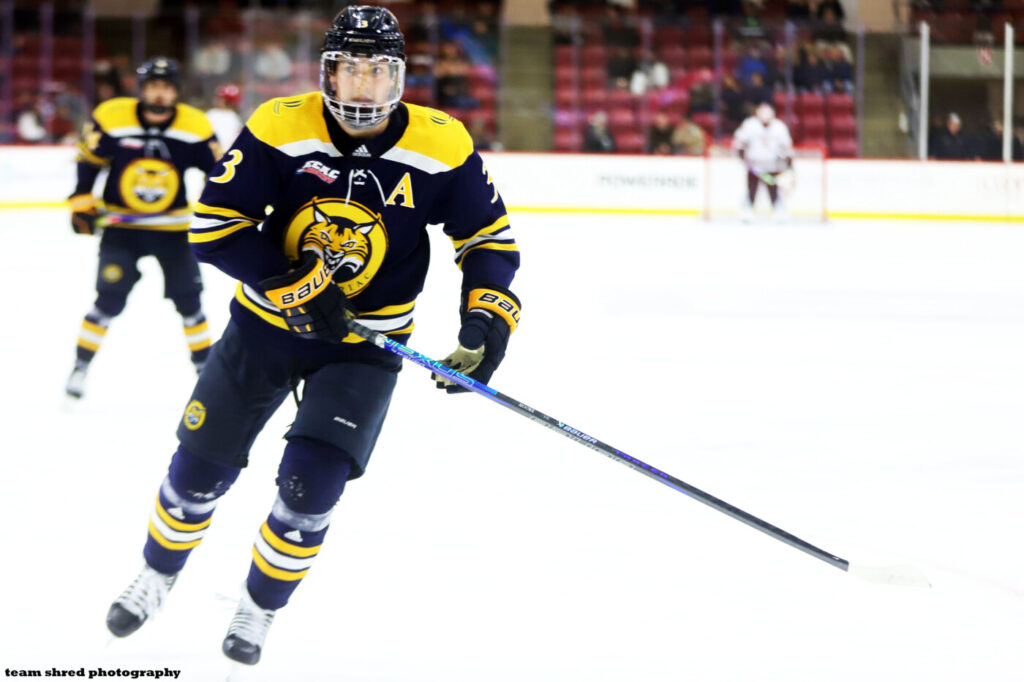 Quinnipiac University Bobcats‘ graduate defenseman Cooper Moore(3) left his 2 years at the school with a +36 rating.