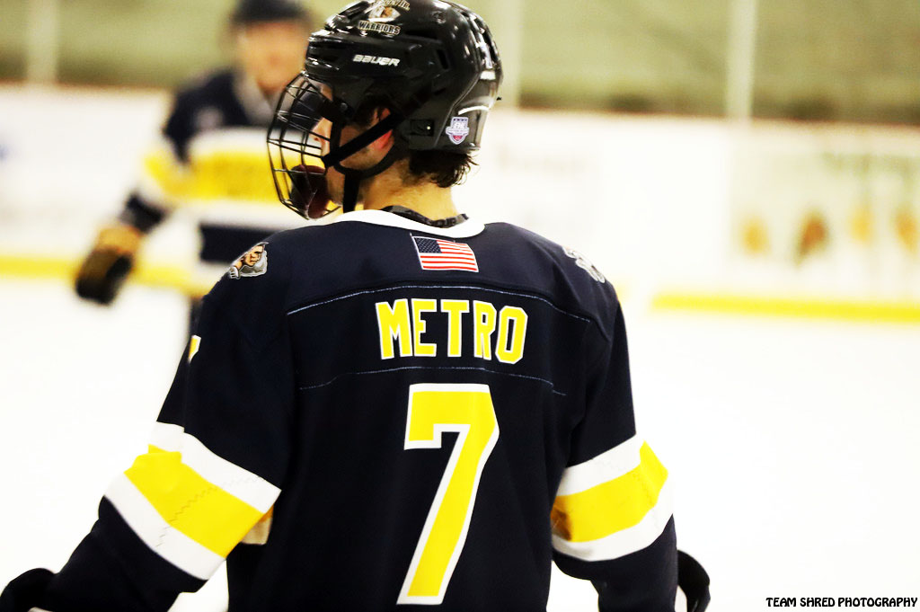 Endicott College Gulls‘ 2023/2024 commit, 2nd year Valley Jr. Warriors‘ defenseman Dominic Metro(7) is a nice grab for the school.