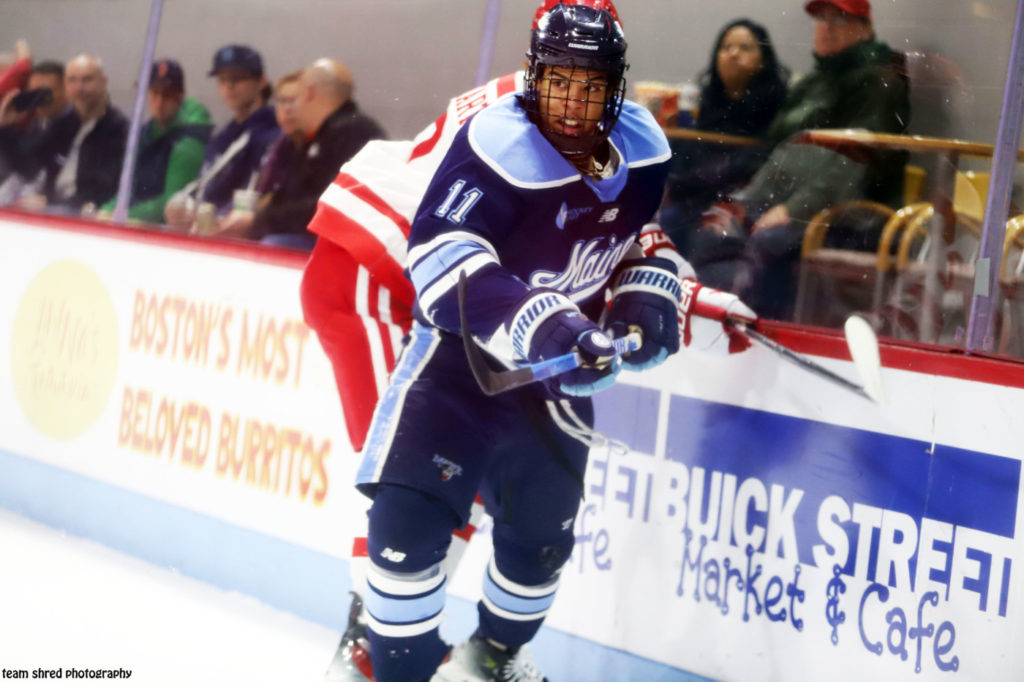 University Of Maine Black Bears‘ senior right wing Donovan Villeneuve-Houle(96) signs an ato with San Jose Barracuda to get his pro career going.