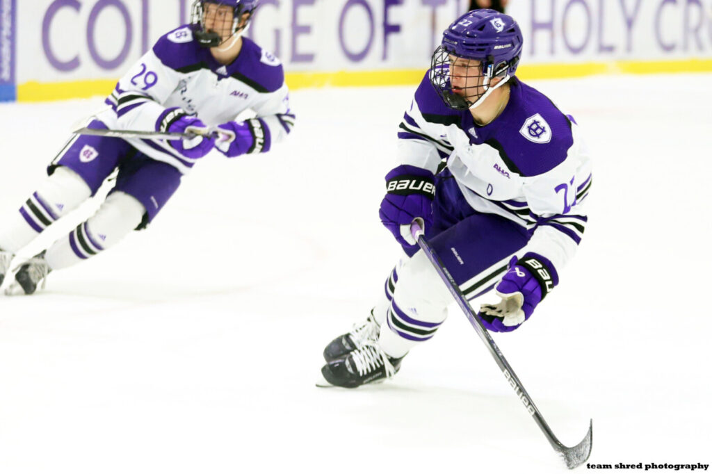 Holy Cross College Crusaders‘ freshman left wing Edward Moskowitz(22) enters the transfer portal after just 7 games of play last season and will skate with Middlebury College Panthers for his sophomore year, 2025/2026.
