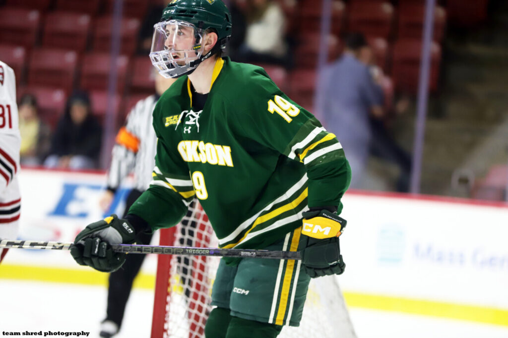 Clarkson University Golden Knights‘ junior center Ellis Rickwood(29) puts up a college best 10 goals and 25 assists in 39 games with a +16 rating, but enters the transfer portal to next play his hockey at University Of North Dakota Fighting Hawks as a senior, 2025/2026.