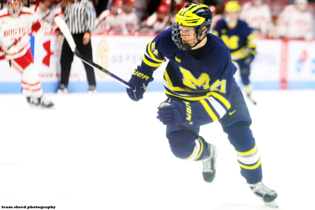 University Of Michigan Wolverines‘ junior left wing Jackson Hallum(21) scores maybe a little conservative, but college best 8 goals and ties his 17 points from his freshman frame to being wooed by draft team (3rd round, 2020, #91 overall) Vegas Golden Knights to sign his 2-year NHL entry level deal.