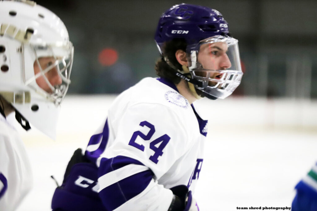 Curry College Colonels‘ senior defenseman Jacob Crespo(5) signs a 1st pro deal with Twin City Thunderbirds after he was traded for his rookie run, 2025/2026.