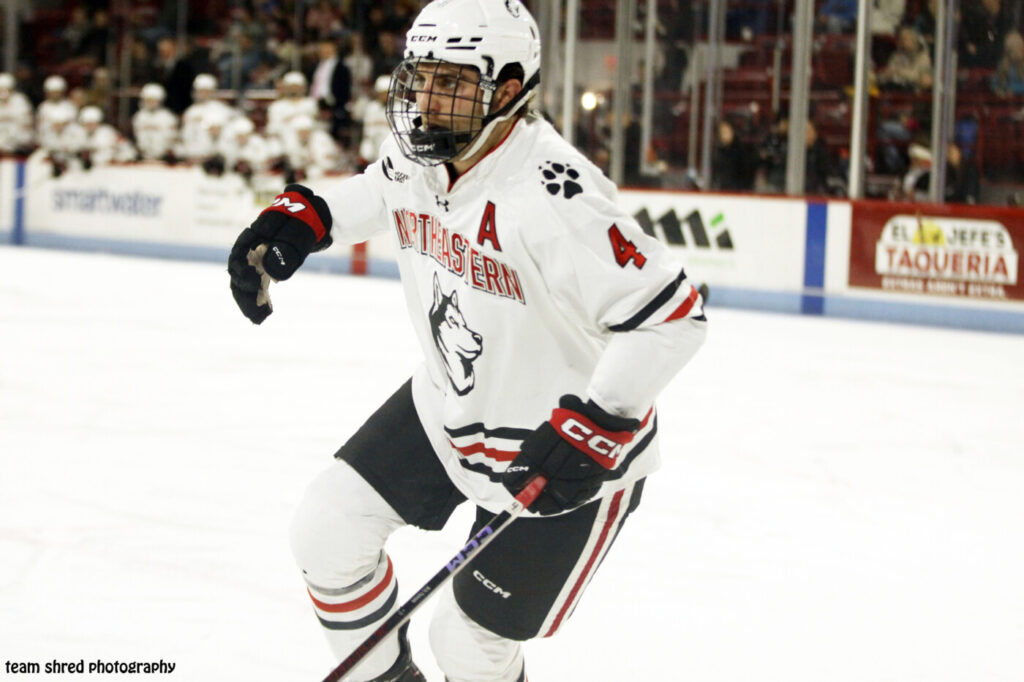 Northeastern University Huskies‘ graduate, assistant captain defenseman Jake Boltmann(4) looks to put up college career highs this season, but will definitely have to work to get up to those 12 assists he had as a sophomore at University Of Notre Dame Fighting Irish.