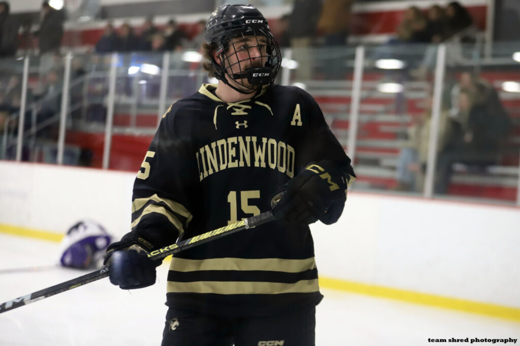 Lindenwood University Lions‘ junior defenseman Joe Prouty(15) played a college high 32 games, scoring 1 goal and 2 assists that he will take to a senior year closer to his Apple Valley, MN home at Michigan Tech University Huskies.