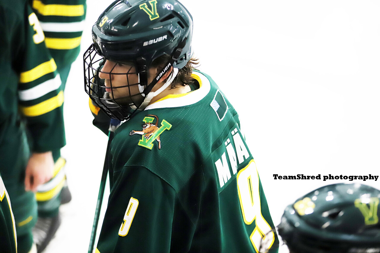 University Of Vermont Catamounts‘ freshman center Joel Määttä(9) has no points in 15 NCAA Division 1 games, but when was called to play for home team Finland in the World Juniors, potted 2 assists in 2 wins before the whole tournament got trashed.