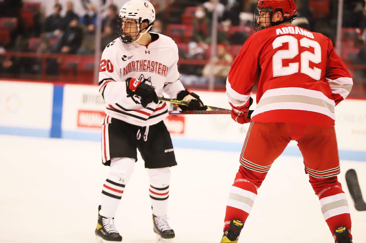 RPI Engineers‘ senior portal transfer from 3 years at Robert Morris University Colonials, where they waved bye bye to hockey last season, huge 6’6′ 249 lbs. French-born right wing Justin Addamo(22) plays a hard skating style for a big man and has 3 goals and 3 assists in 17 games.