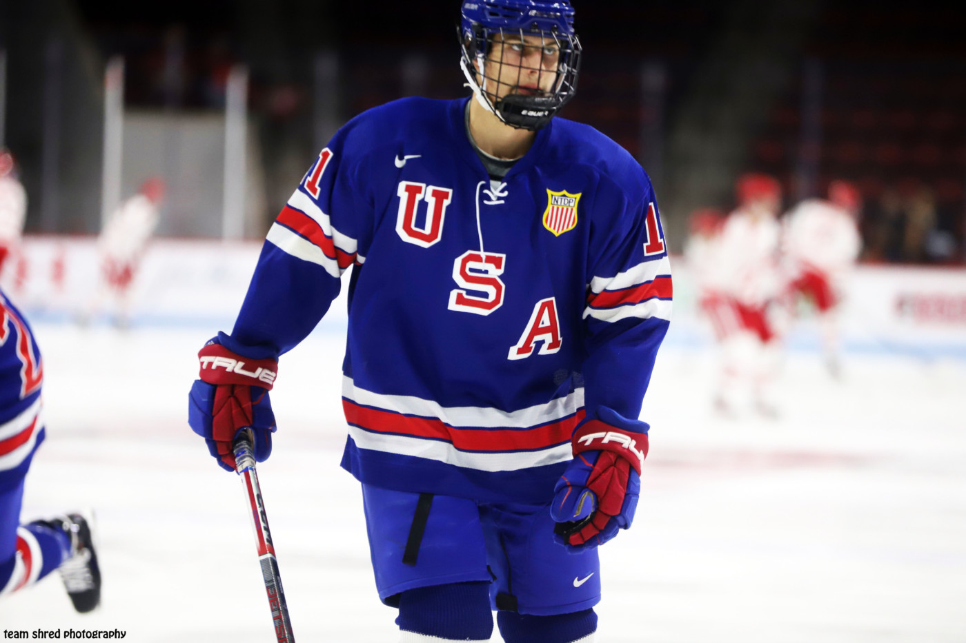 Boston University Terriers‘ 2024/2025 commit, 2nd year USNTDP center Kamil Bednarik(11) looks to either pass or equal marks he set in his 1st season in the program, 13 goals and 17 assists in 39 games.