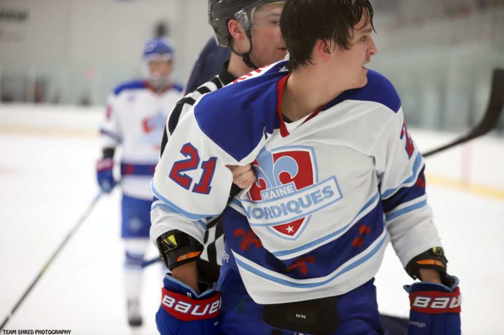 Maine Nordiques‘ 2nd year left wing Kellen Murphy(21) looks to blow the top off NAHL scoring with 7 goals and 6 assists in 8 games to start 2023/2024.