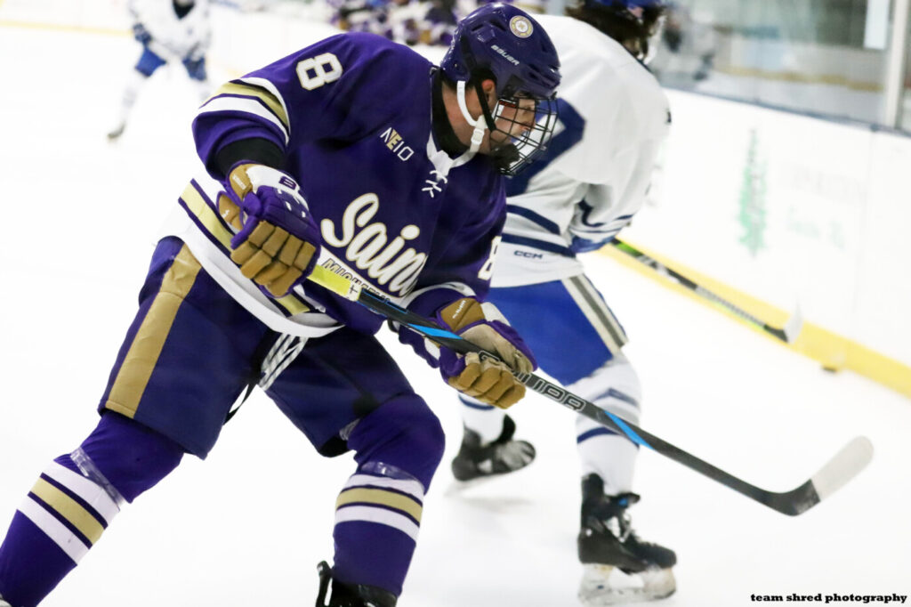 St. Michael’s College Purple Knights‘ junior defenseman Kyle Lee(8) ties his 1 goal and has a new best 2 assists and 3 points with a +3 rating in a season that looks to be heading in the right direction for him and the college club.