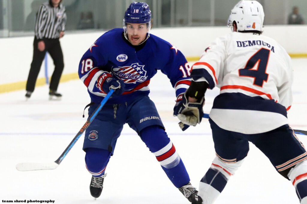 Rochester Jr. Americans‘ 2nd year left wing Landon Brownlee(18) taks a junior best scoring 19 goals and a 2nd straight season of 17 assists and new high 36 points in 58 NAHL games with a +18 rating.