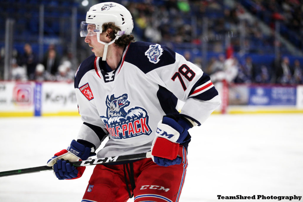 The 6’2″ 195 lbs. forward skated 13 ECHL games on reassignment by contract club Hartford Wolf Pack as an AHL rookie.