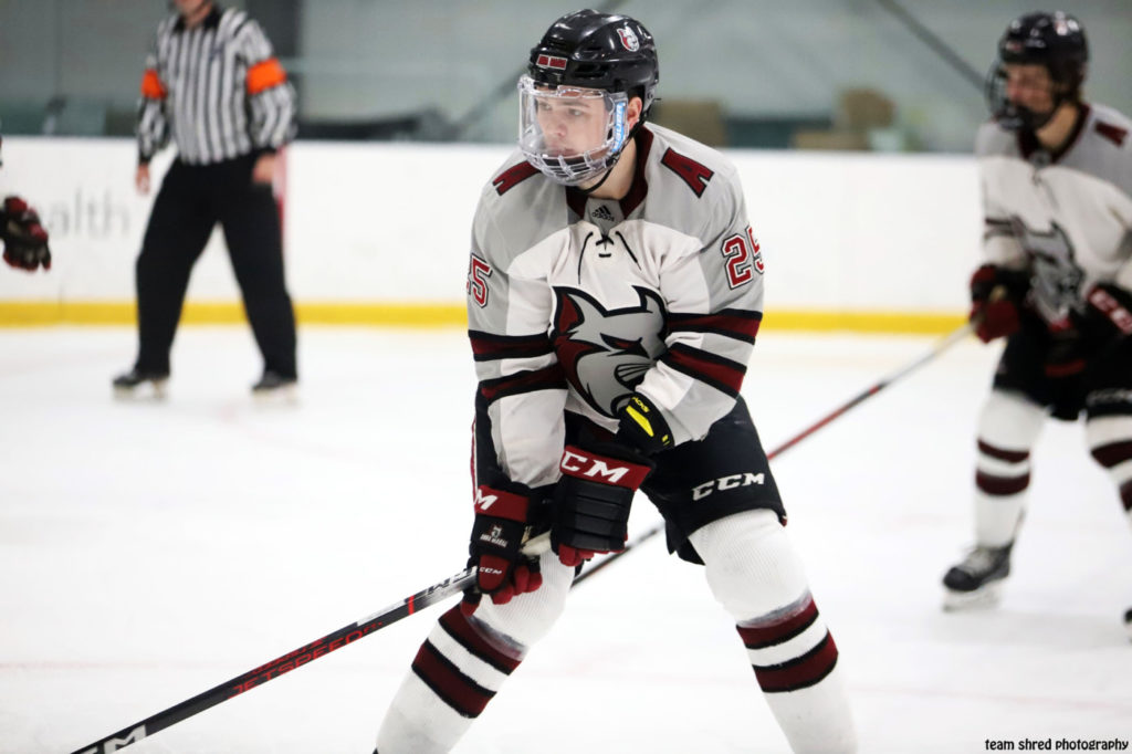 Anna Maria College AMCATS‘ senior right wing Matthew Gilbert(19) leads the maybe surprising 5-3, with wins in their last 4 straight, scoring 5 goals and 1 assist in 7 games.
