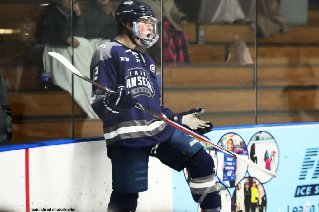 St. Anselm College Hawks‘ junior left wing Max Burum(12) scored 2 goals and 2 assists to lift his team to the NE-10 playoff semi-finals with a commanding 8-2 victory.
