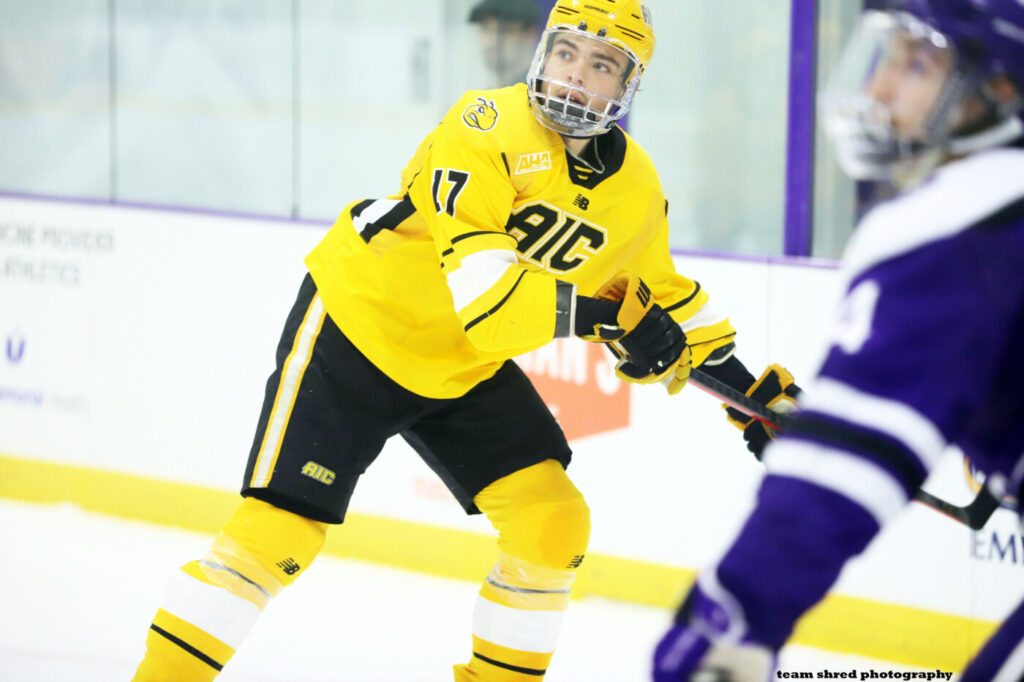 American International College Yellowjackets‘ Swedish-born, senior left wing Oscar Geschwind(17) takes a 2nd season of 7 assists to a 1st pro contract back home in HockeyEttan with Tingsryds AIF for 2025/2026.