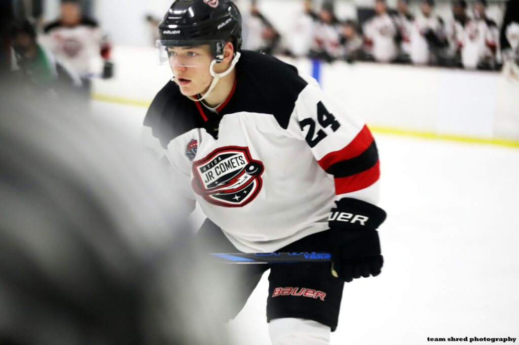Utica Jr. Comets‘ 2nd year defenseman Owen Hodgett(24) takes a junior high games played 54, scoring new junior bests 3 goals and 11 assists, which he takes to a 2025/2026 commit at Suffolk University Rams.