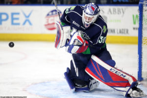 Atlanta Gladiators‘ 2nd season, 5th year net minder Chris Nell(30) recently appeared in his 100th ECHL game.
