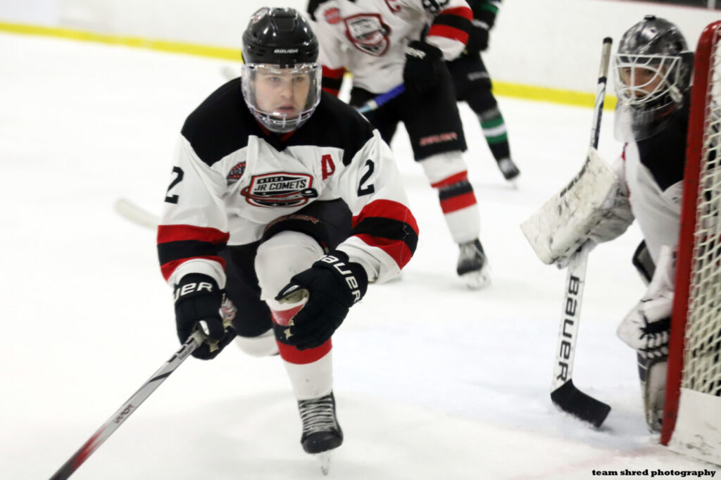 Utica Comets‘ 2nd year USPHL/NCDC defenseman Ricky Volpe(2) scored a junior best by a long shot 13 goals and 24 assists in 53 games that he will take to a Bowdoin College Polar Bears‘ commit in 2025/2026.