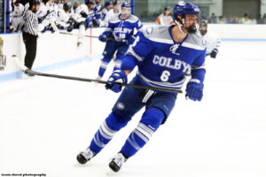 Colby College Mules‘ sophomore defenseman Riley Rosenthal(6) played only 3 games last season with Stonehill College Skyhawks, so entered the transfer portal.