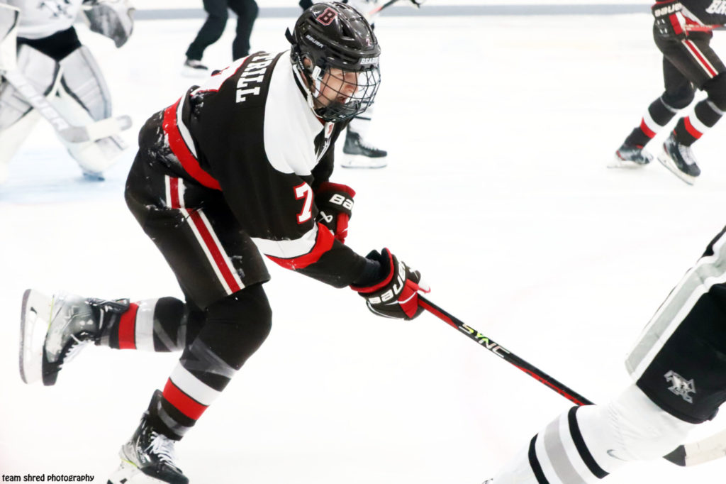 Brown University Bears‘ 2022/2023 commit Ryan Bottrill(7) is putting up junior career highs for assists (35) and points (48) with goal scoring off by 3 at the moment for Maryland Black Bears in 41 NAHL games.