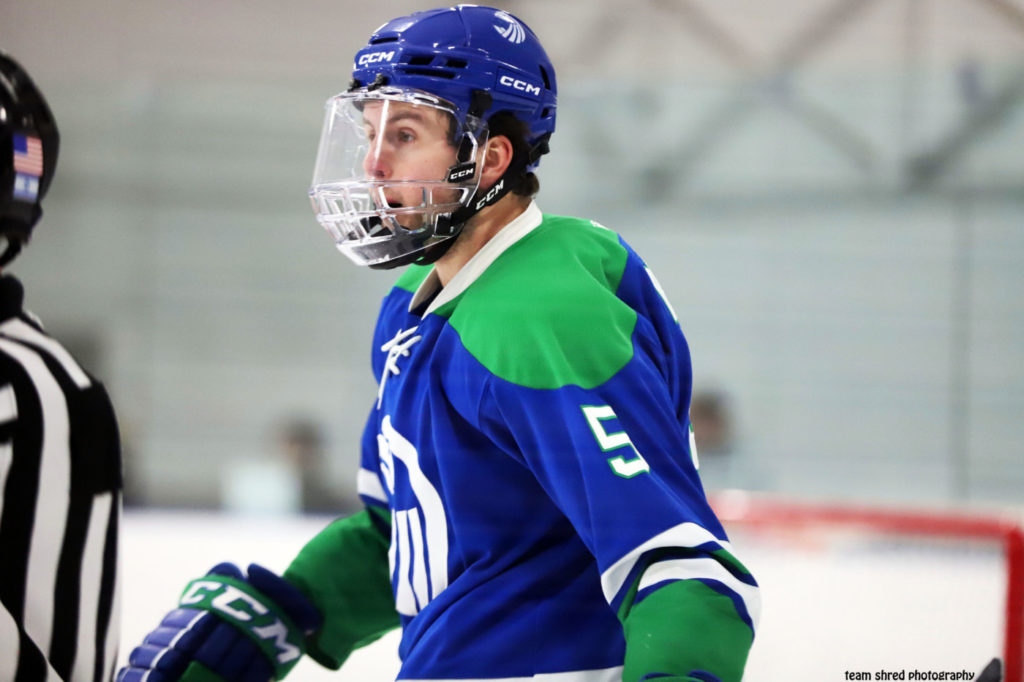 Salve Regina University Seahawks‘ senior left wing Seth Benson(5) finishes up school and signs a 1st pro deal with Atlanta Gladiators.