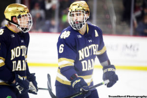 Grand Rapids Griffins‘ rookie defenseman Tory Dello(5) signed an ato with the team after finishing up his 4th season at Notre Dame University Fighting Saints, tying his career high 13 points with a modest new best 3 goals.