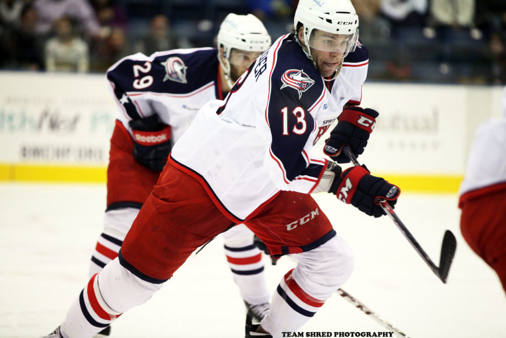 Trent Vogelhuber(13) retired from pro hockey a few years ago and immediately was adopted by Cleveland Monsters to become their assistant coach, a role he’s filled for the last 4 seasons.