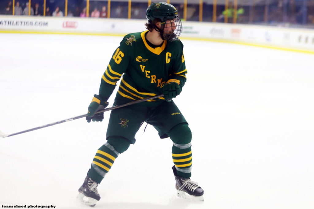 University Of Vermont Catamounts‘ senior 2-year captain, center Will Zapernick(16) took a college best 14 assists and 17 points in 35 games last season to a 1st contract with Wichita Thunder.