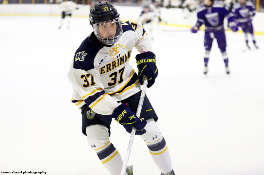 Merrimack College Warriors‘ junior defenseman Zach Bookman(37) takes his 3 goals and 14 assists in 33 games into the transfer portal to next play at Western Michigan University Broncos as a senior, 2o25/2026.