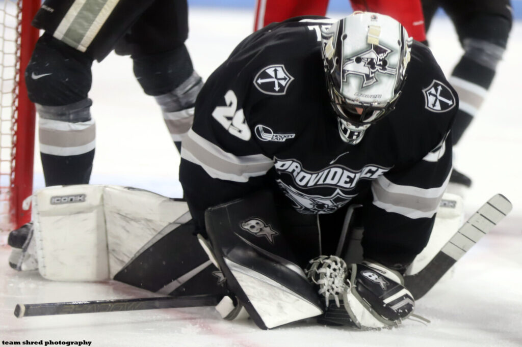 Merrimack College Warriors‘ senior goaltender Zachary Borgiel(29) will do a year of eligibility at rival Providence College Friars to start a graduate program, 2024/2025.