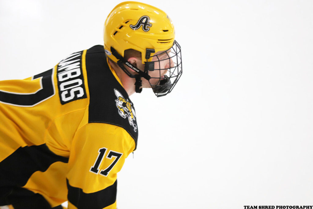 Senior defenseman Zak Galambos(17) enters the transfer portal for a 2nd time after a great junior year at American International College Yellowjackets, scoring college bests 5 goals and 24 assists for 29 points in 36 NCAA Division 1 games.