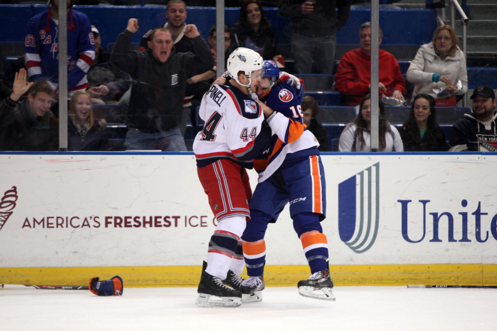 Not exactly a battle of the giants: Bridgeport Sound Tigers‘ 6’ 185 lbs. Harry Zolnierczyk(16) vs. Hartford Wolf Pack 6’2″ 216 lbs. defenseman Steve Spinell(44). […]